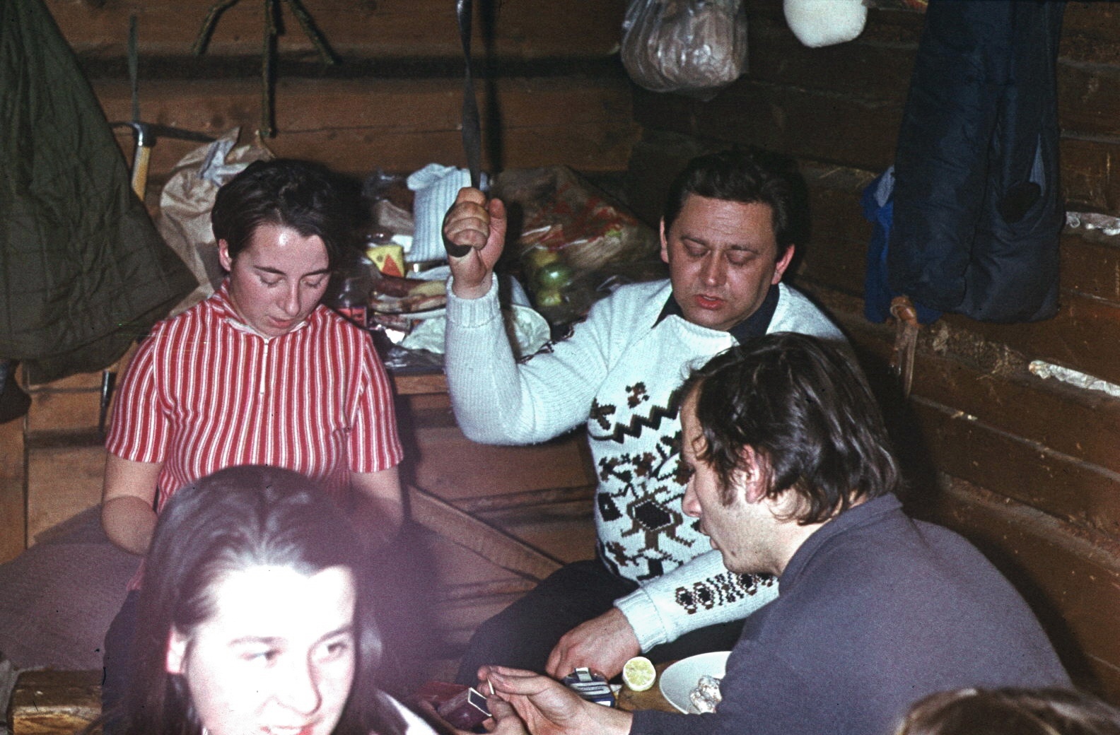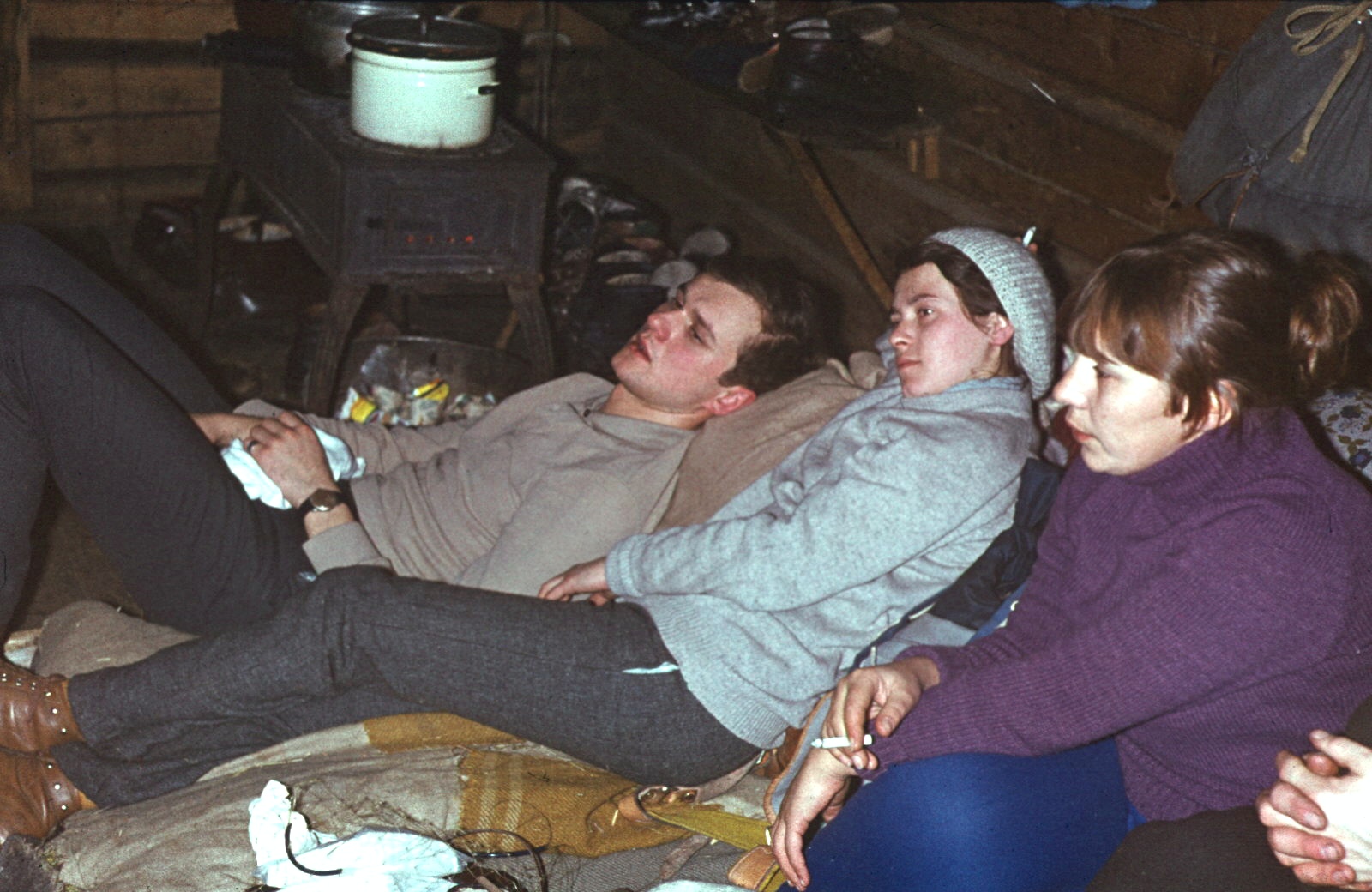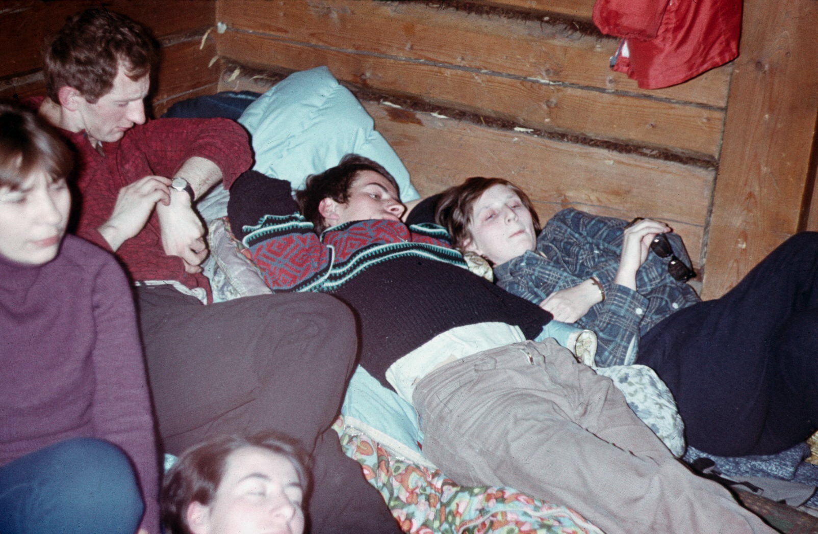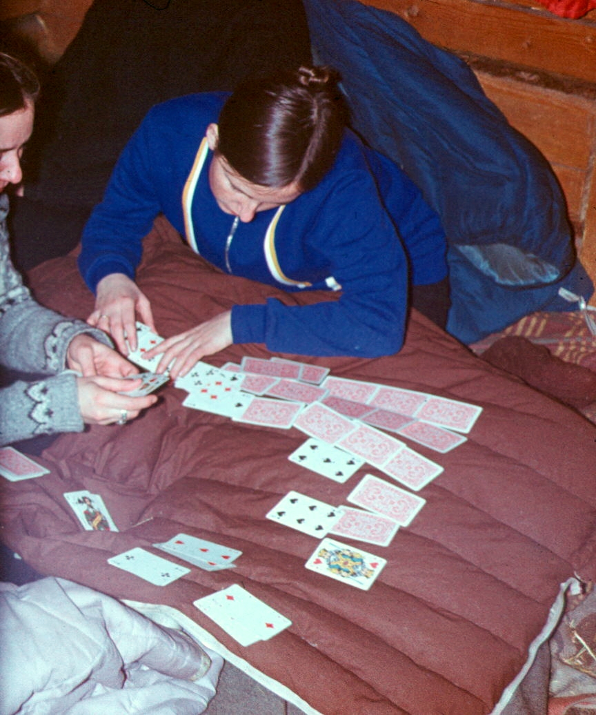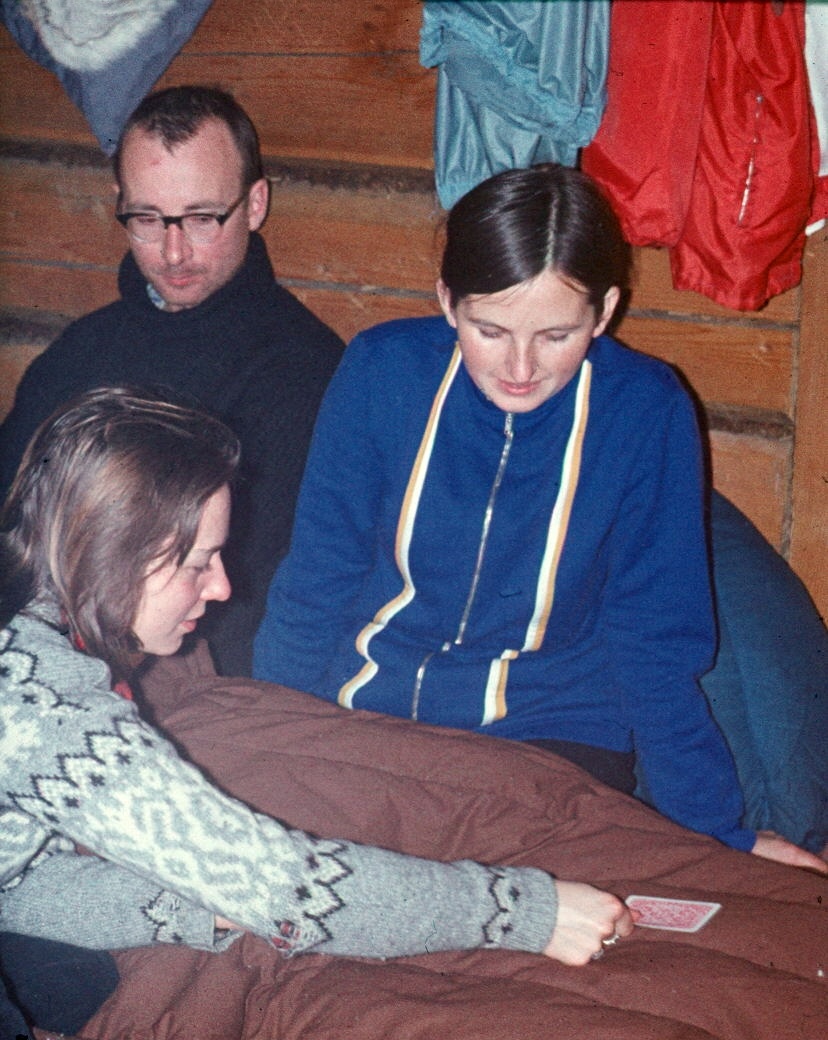 Grudzień’71. Ostatnia zima starej koliby – „Rysów”. Ewa Kuźmińska, w śpiworze Ania Bajtała, z tyłu Bożena Palmowska rżnie w karty.