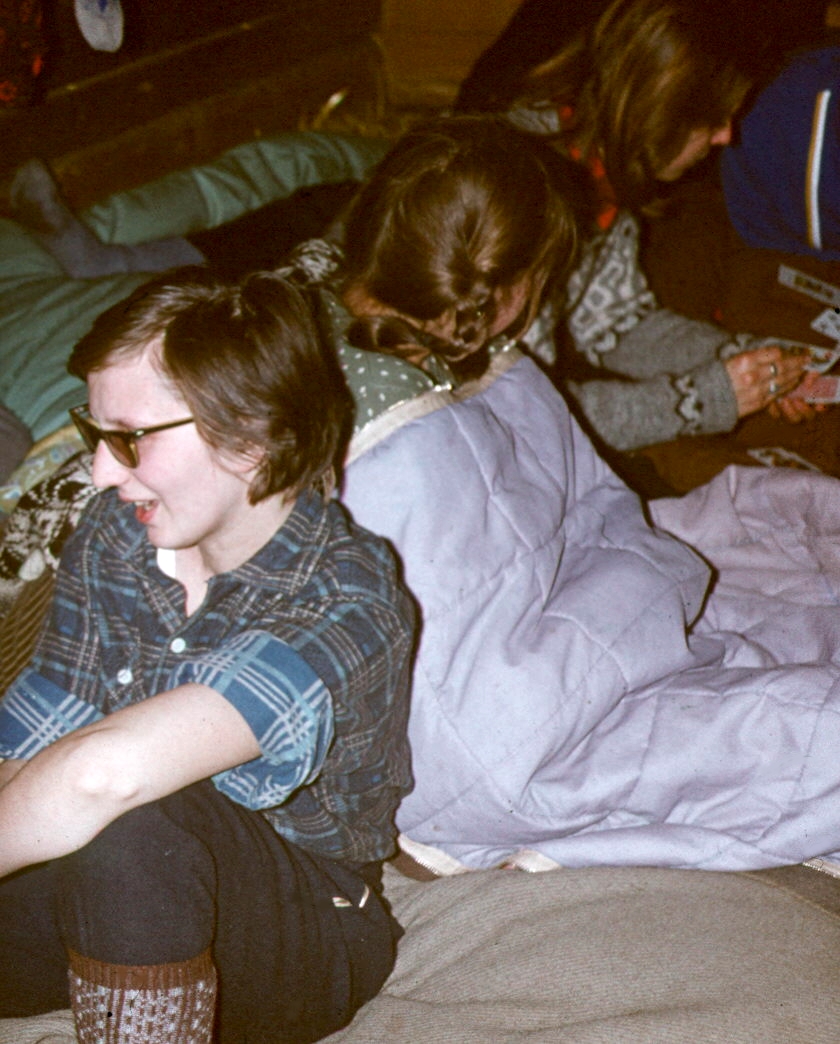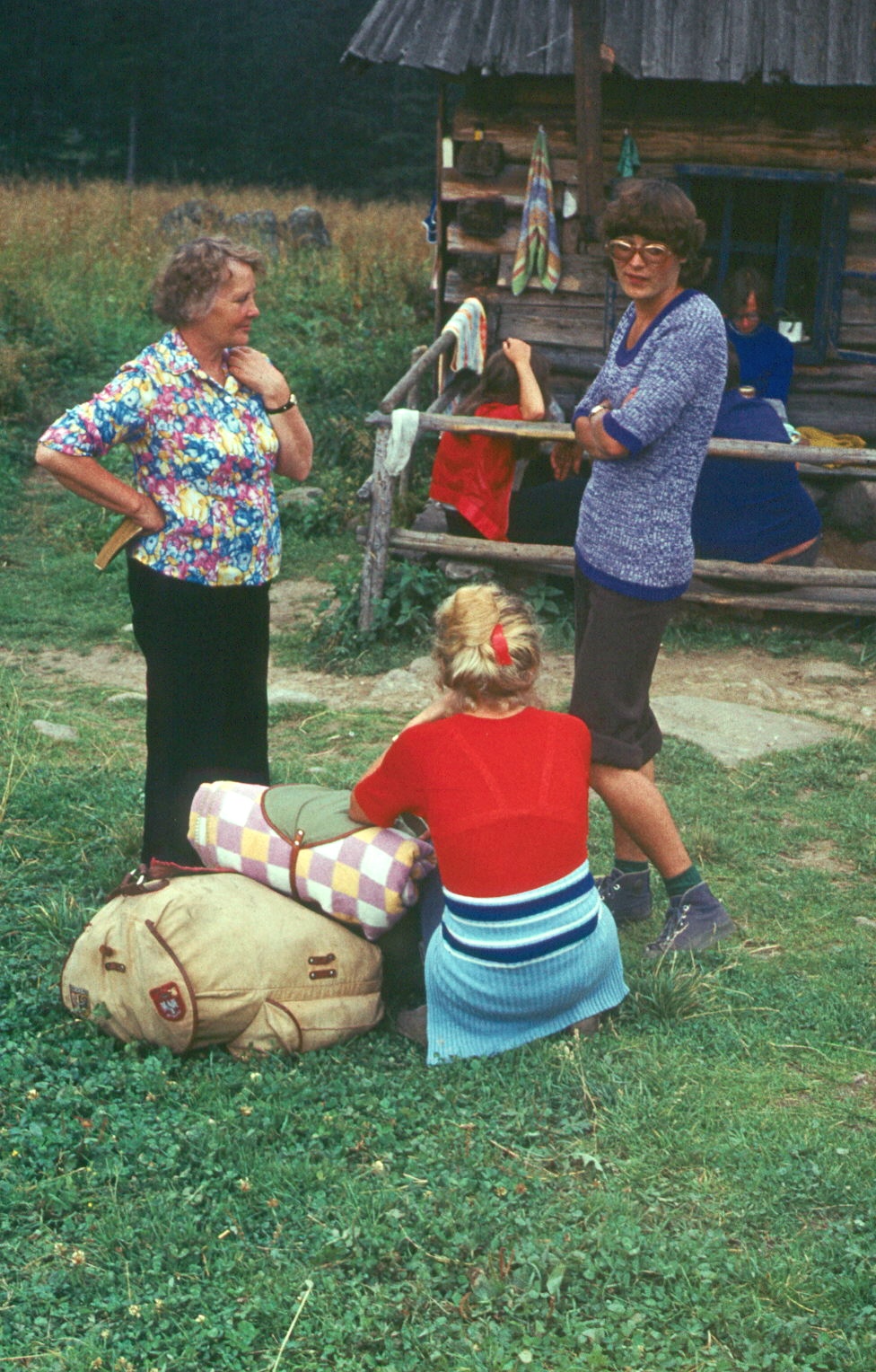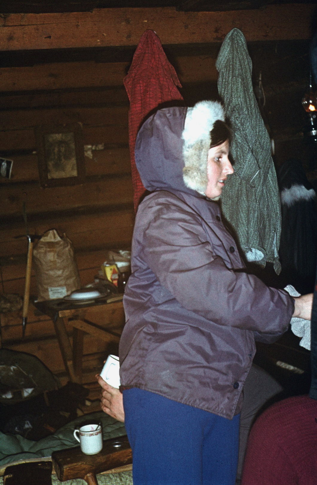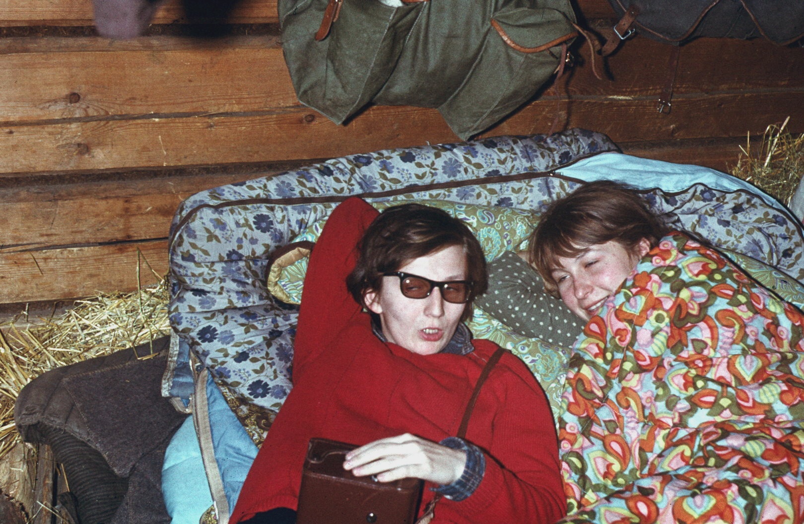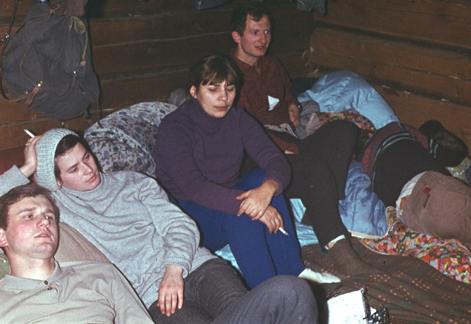Grudzień’71. Ostatnia zima starej koliby – „Rysów”. Ewa Kuźmińska, w śpiworze Ania Bajtała, z tyłu Bożena Palmowska rżnie w karty.