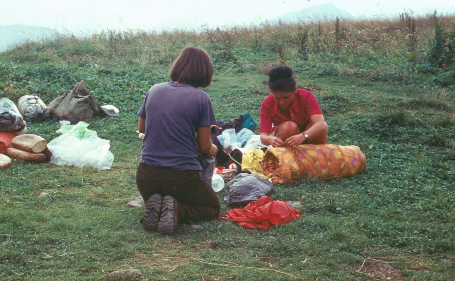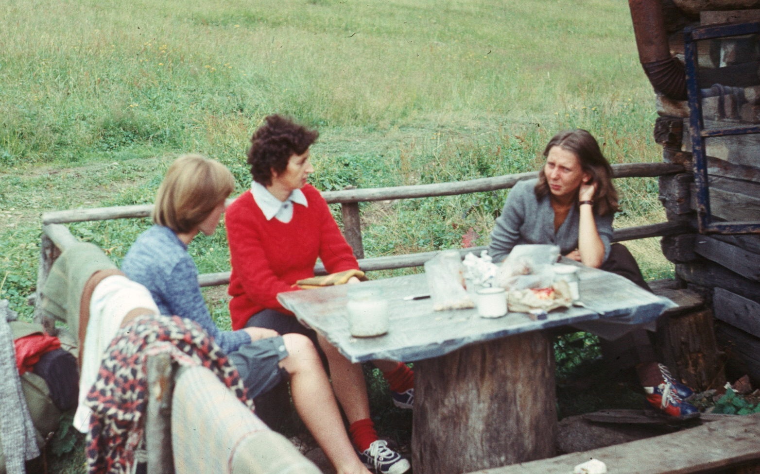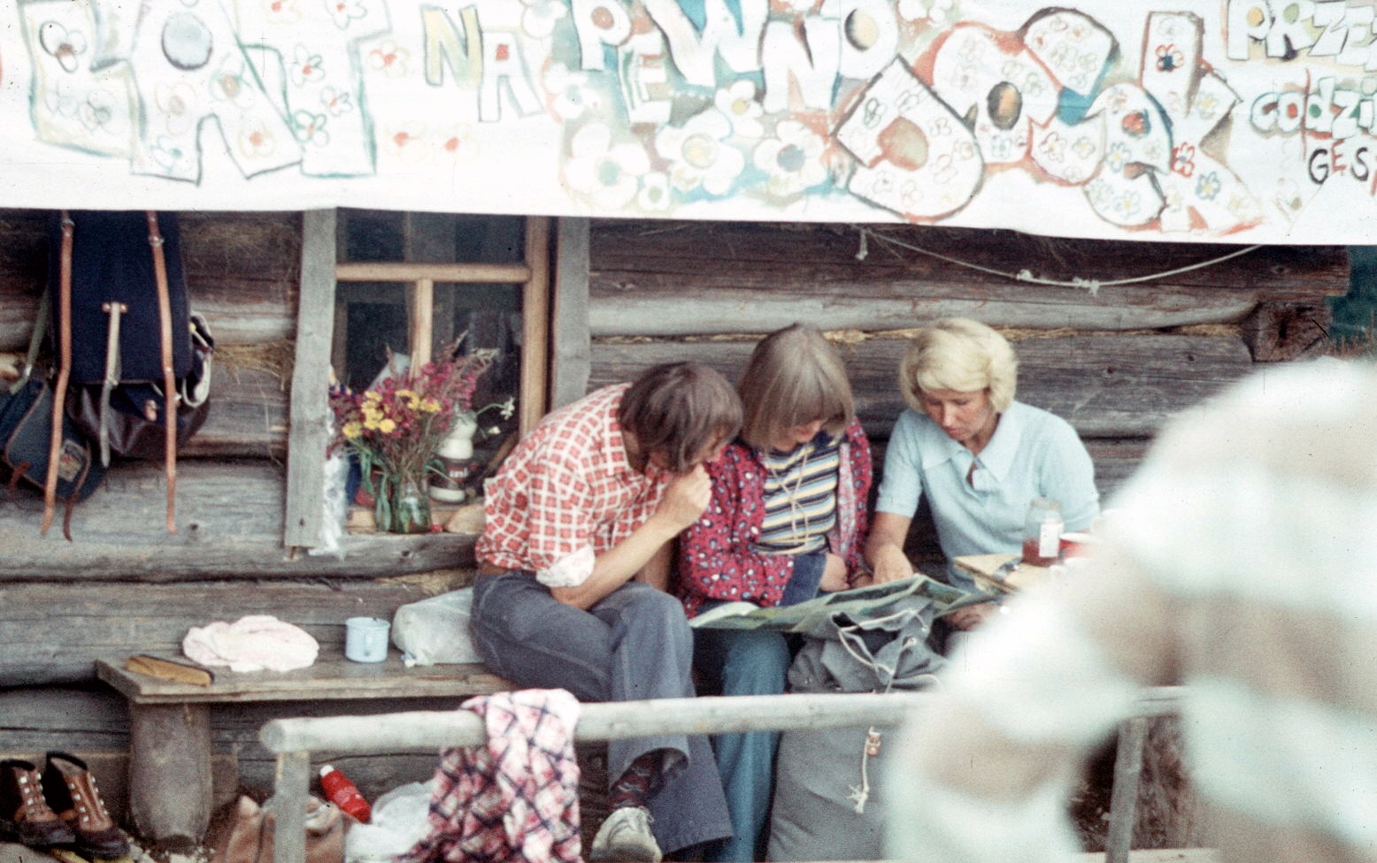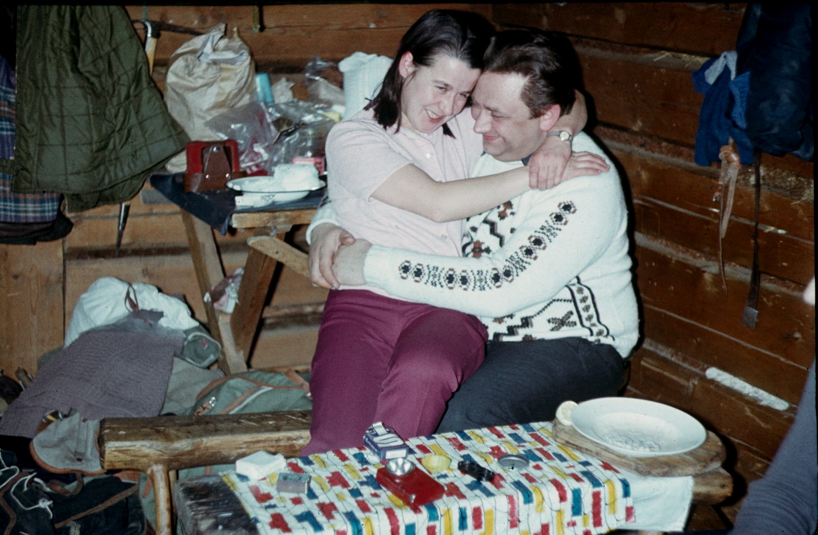 Grudzień’71. Ostatnia zima starej koliby – „Rysów”. Ewa Kuźmińska, w śpiworze Ania Bajtała, z tyłu Bożena Palmowska rżnie w karty.