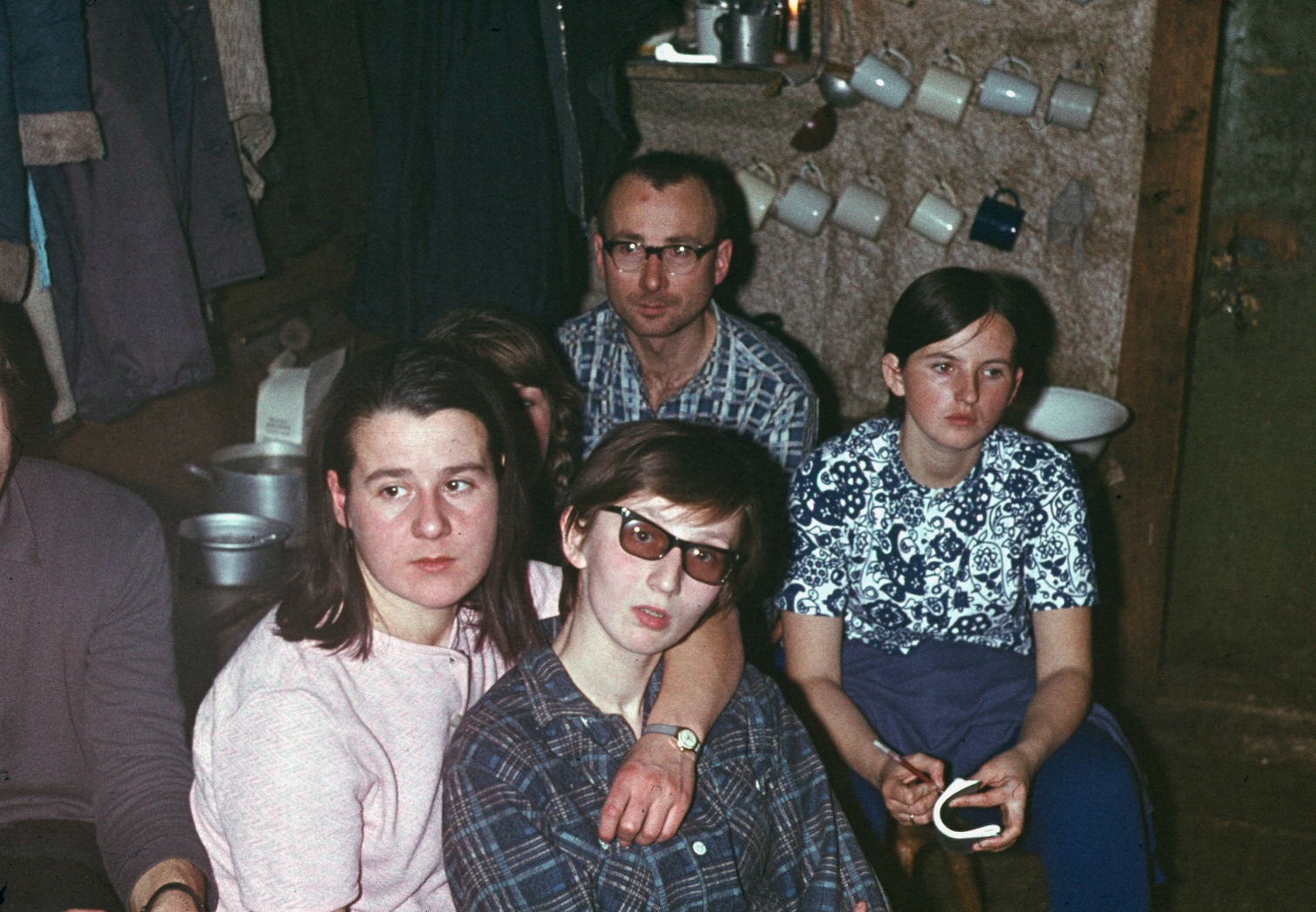 Grudzień’71. Od lewej kawałek Janka, Ira, Ewa, wyżej Tadziu i Basia. Po prawej wejście do izby z sieni.