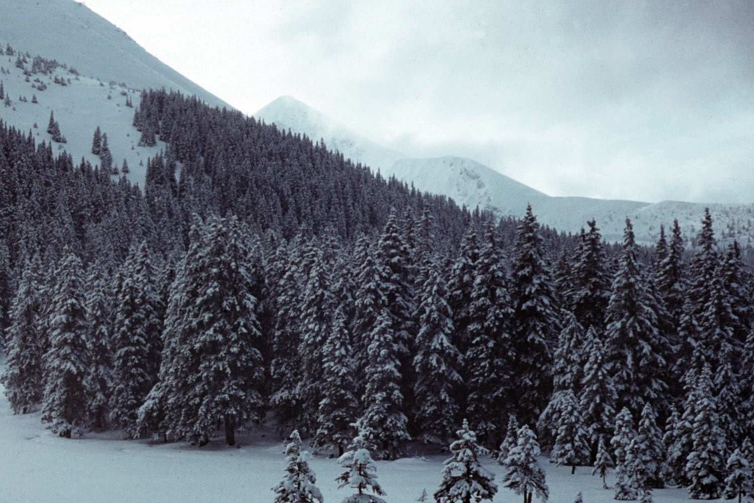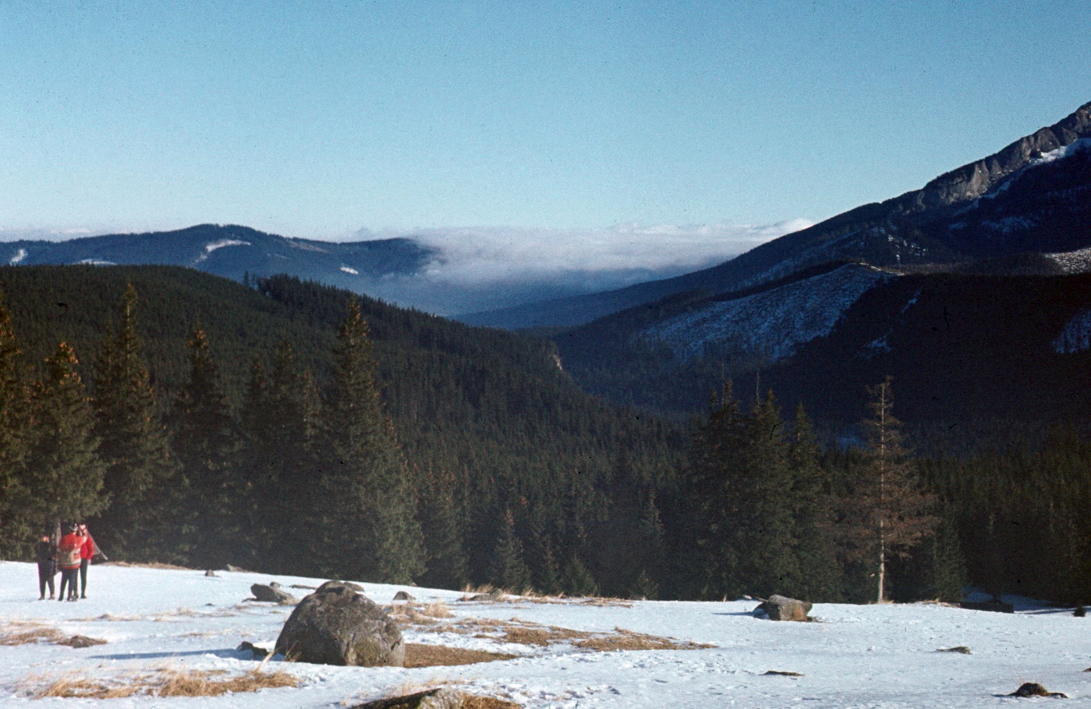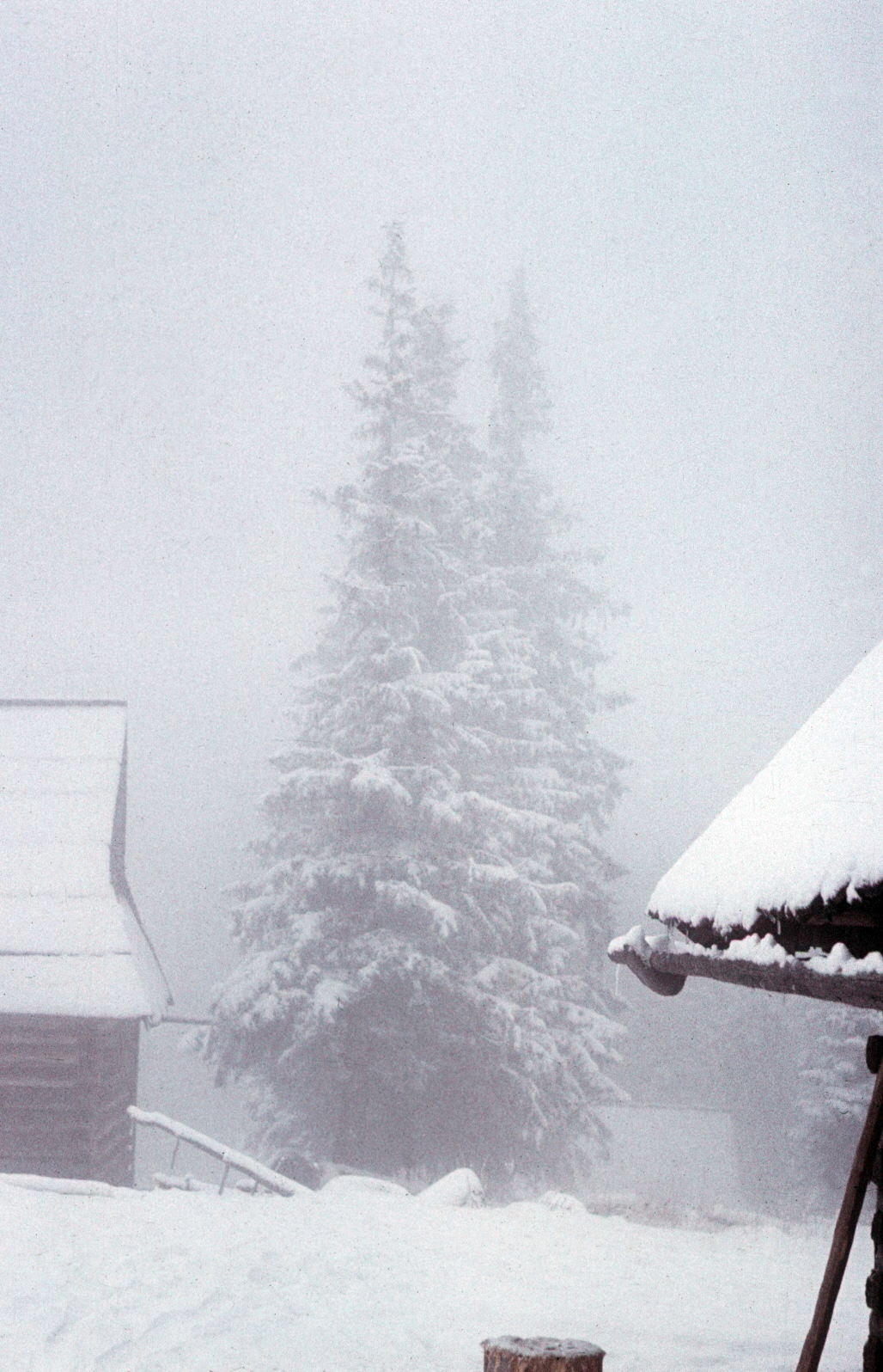 Grudzień’71. Zimowe mgiełki. Z lewej „Krywań”, niżej dach Goliasa, z prawej fragment „Rysów”.