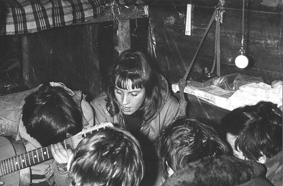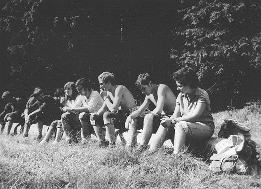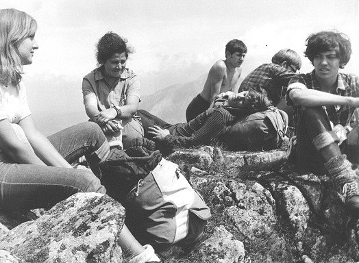 Sierpień’72. Gdzieś na grani Wołoszyna. Od lewej siedzi: Mariola, Jadzia, Grzegorz leży, ???, ???, Sławek