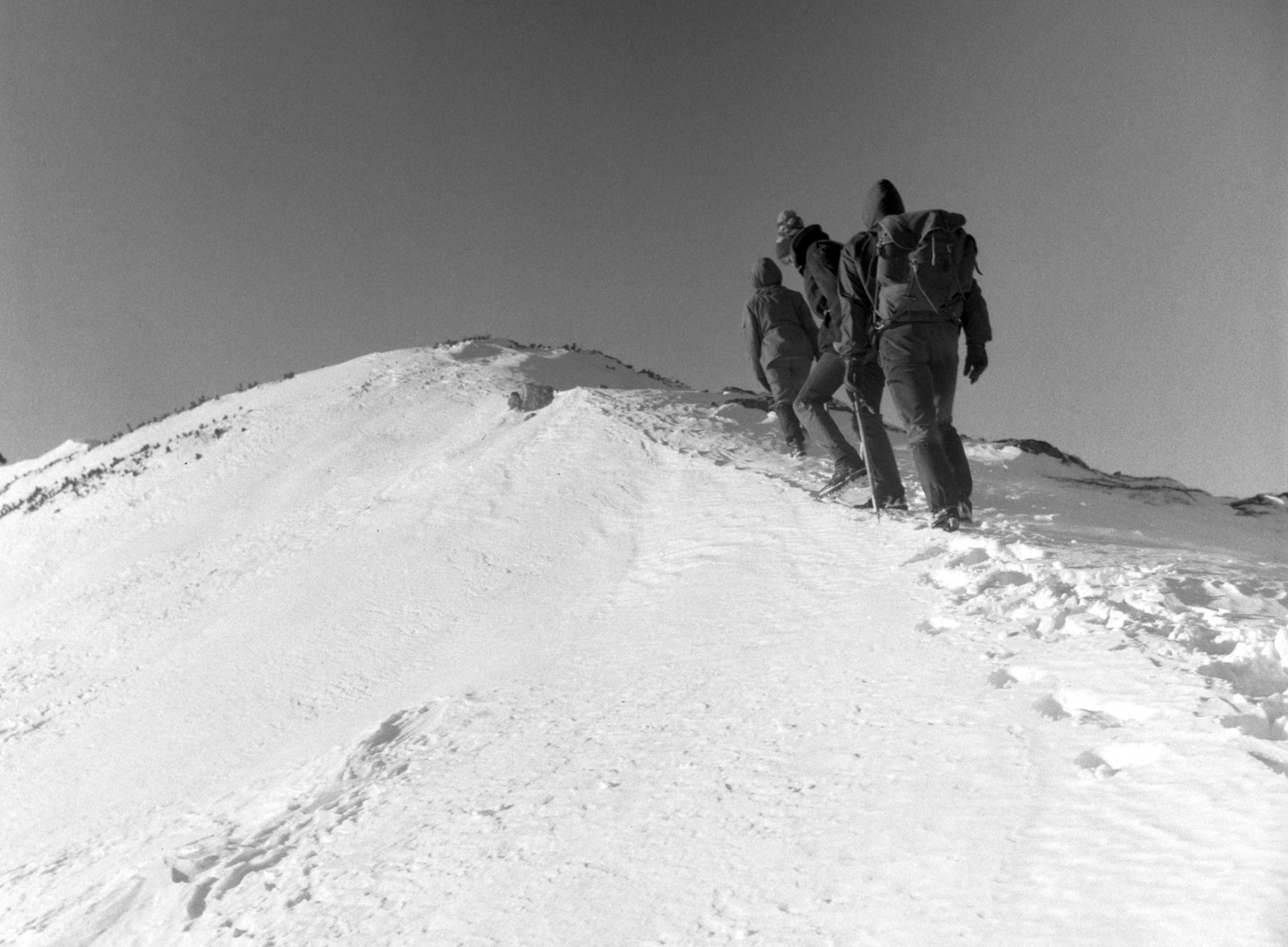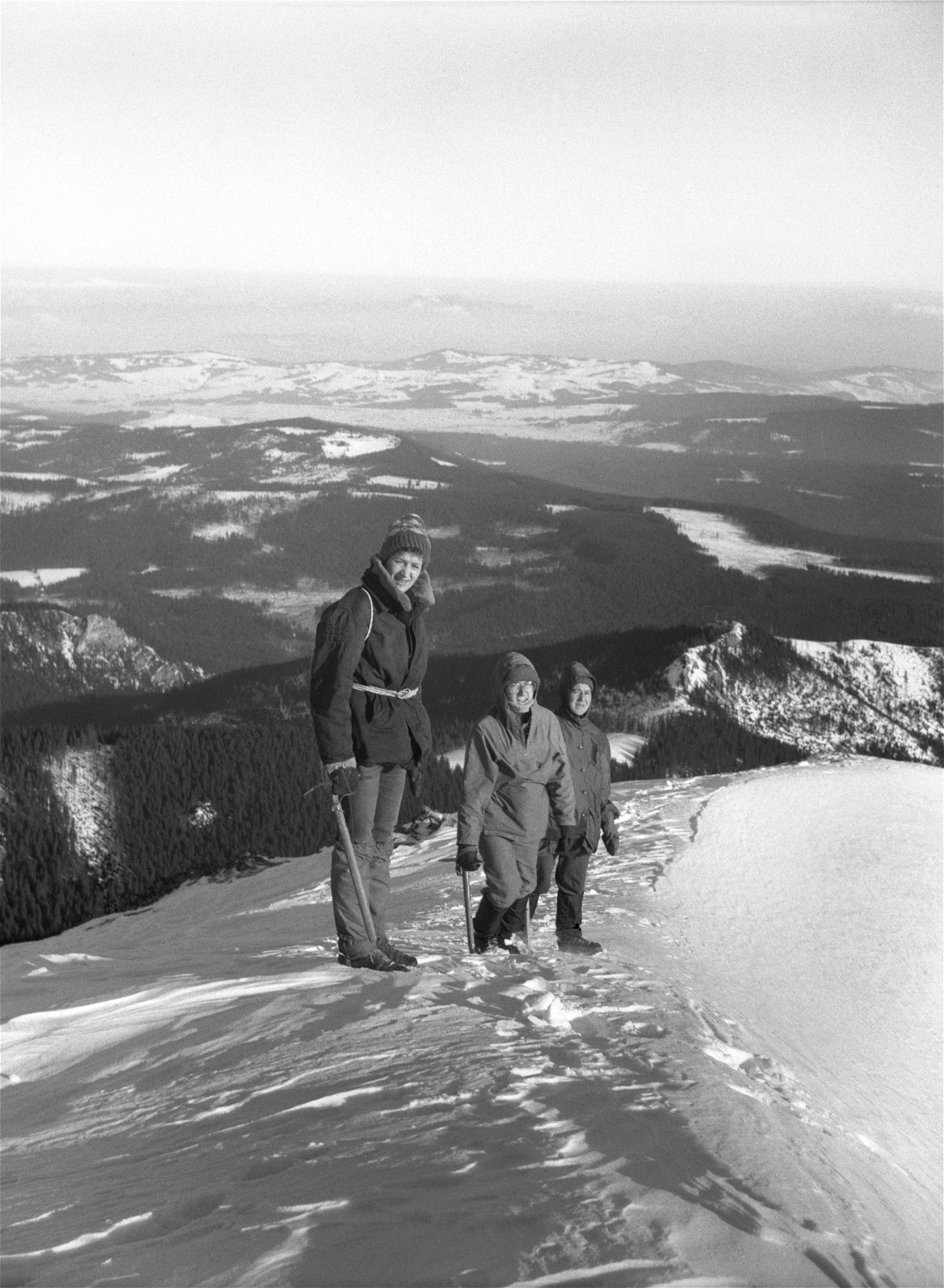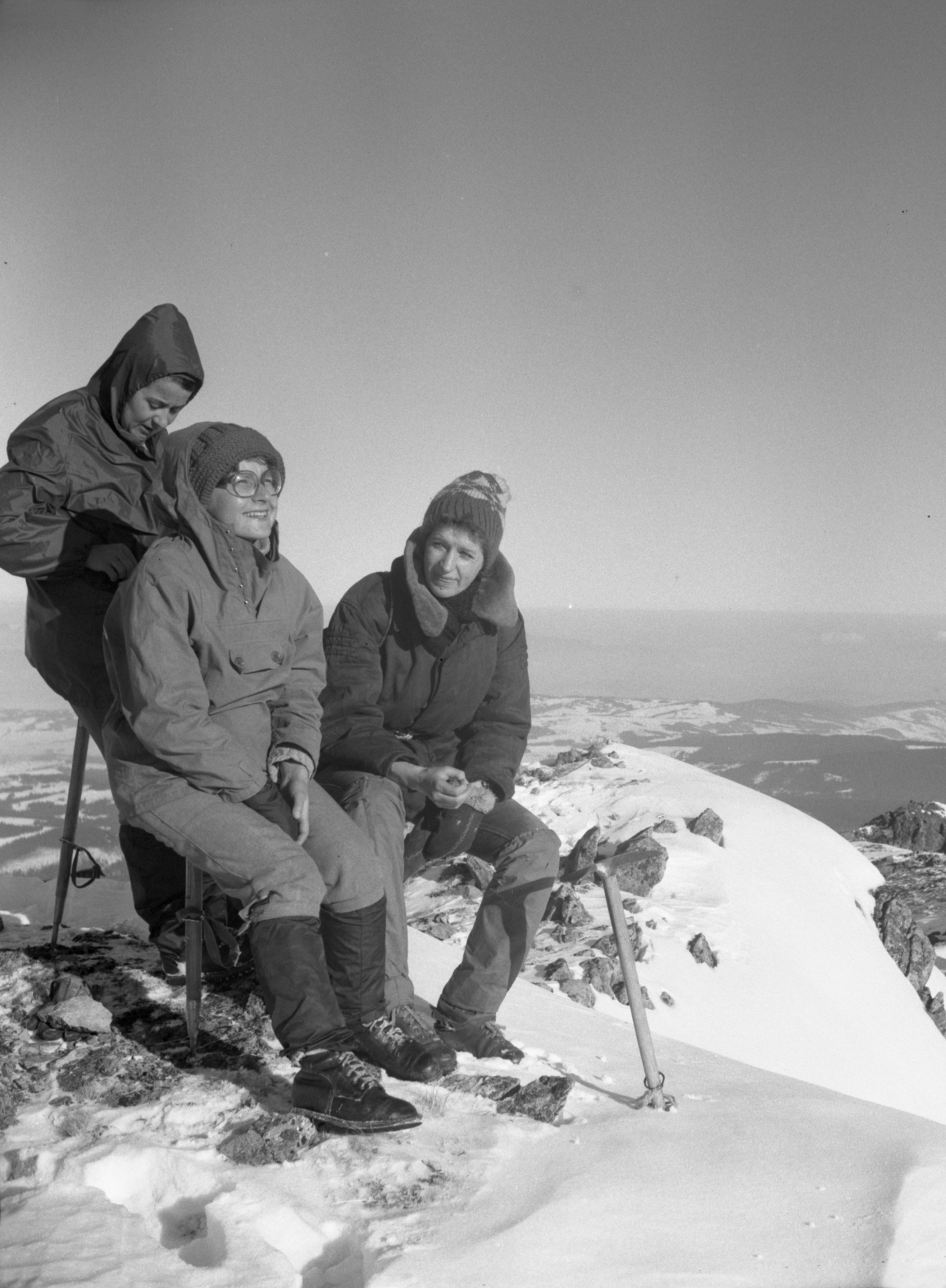 Grudzień’75. Na grzbiecie Koszystej. Ewa, Basia, Ira. Na horyzoncie wystaje z chmur chyba Turbacz.