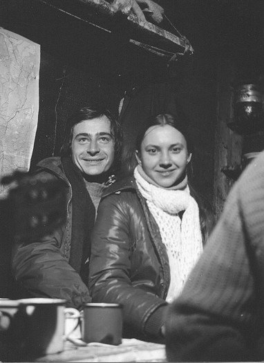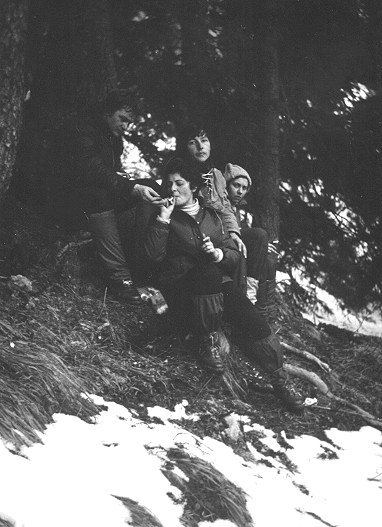 Zima’75 albo 76. Na Filipczańskim Wierchu. Jadzia odpala od Janka, obok młody Pecol jako łącznik międzypokoleniowy, za nim Grażyna.