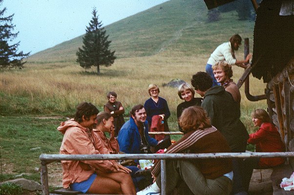 Sierpień’77. Od lewej Andrzej, Grażyna, stoi Marianna(?), Gaba, Wanda, Jadzia mała, Jadzia średnia, Janek, włazi Grześ, siedzi ??, tyłem odwrócona Grażyna.