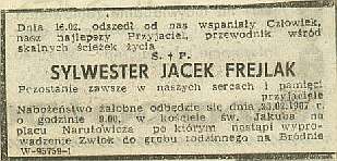 Dr Sylwester Jacek Frejlak, autor kilku tekstów umieszczonych w „Królowej Tatr” i współpracownik miesięcznika „W drodze”, odszedł od nas niespodziewanie 16 lutego 1987 roku, w wieku 54 lat. Był wybitnym biologiem-dydaktykiem w Instytucie Kształcenia Nauczycieli w Warszawie, autorem podręczników szkolnych oraz wielu publikacji z zakresu biologii i ochrony przyrody. Działał również gorliwie w Lidze Ochrony Przyrody.