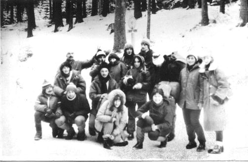 Tramwaj na Wierchu Porońcu (2.I.1979). Od lewej kucają: Murzyn, Leszek Makowiecki (z kapeli Babsztyl), Halusia, Romka; nad nimi: Jola Wituch, Czesiek Giera, Włodek Dżdżownica, Jędrek Maciata, Anka Wituch, Majka Ruda, Jola z Lublina, Włodek Mamuśka, pochylony Juras i dwie Poznanianki. Nad Majką znak przystanku PKS.